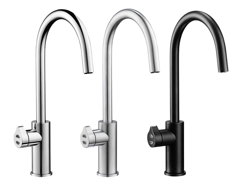 Nová elektronická výdejní armatura pro ZIP HydroTap® s bočním ovládáním ve třech provedeních povrchové úpravy, otočné raménko 22 cm, výška 42 cm, montážní otvor průměr 35 mm.
